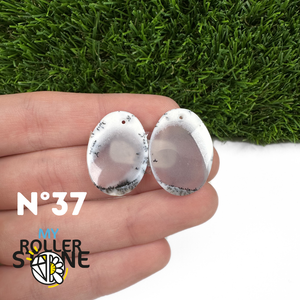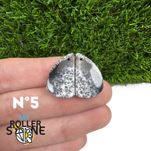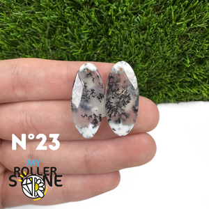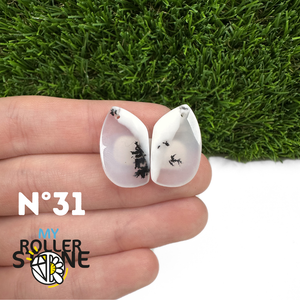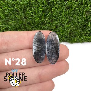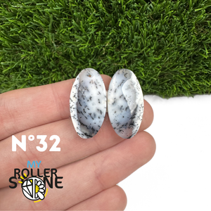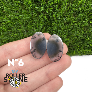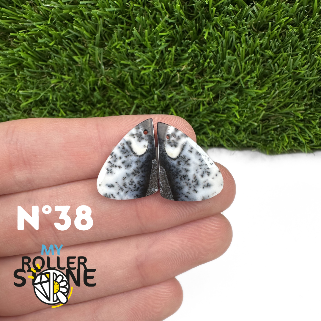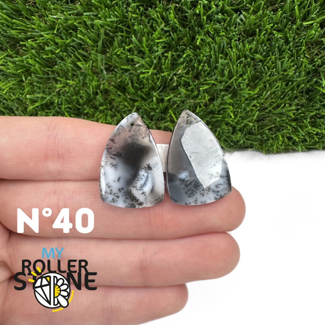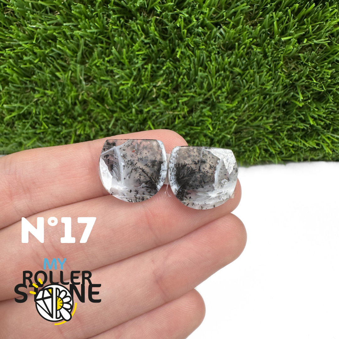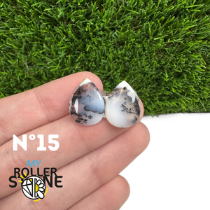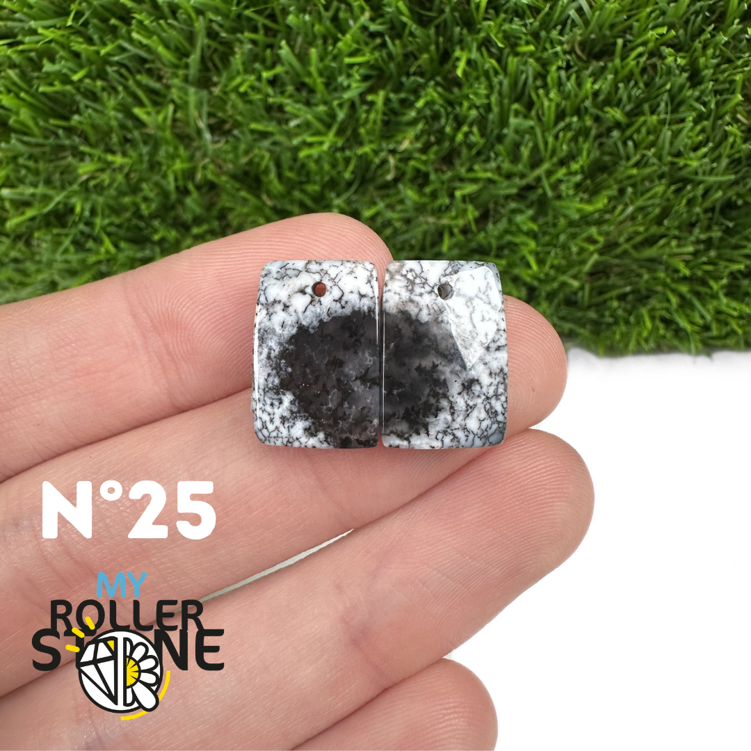 Cette paire de cabochons percés en Opale Dendritique naturelle révèle des motifs arborescents uniques, formés naturellement au cœur de la pierre. Chaque paire présente un contraste élégant entre un fond clair et des inclusions dendritiques sombres, offrant un rendu visuel harmonieux et distinctif, particulièrement recherché pour la création de boucles d’oreilles.