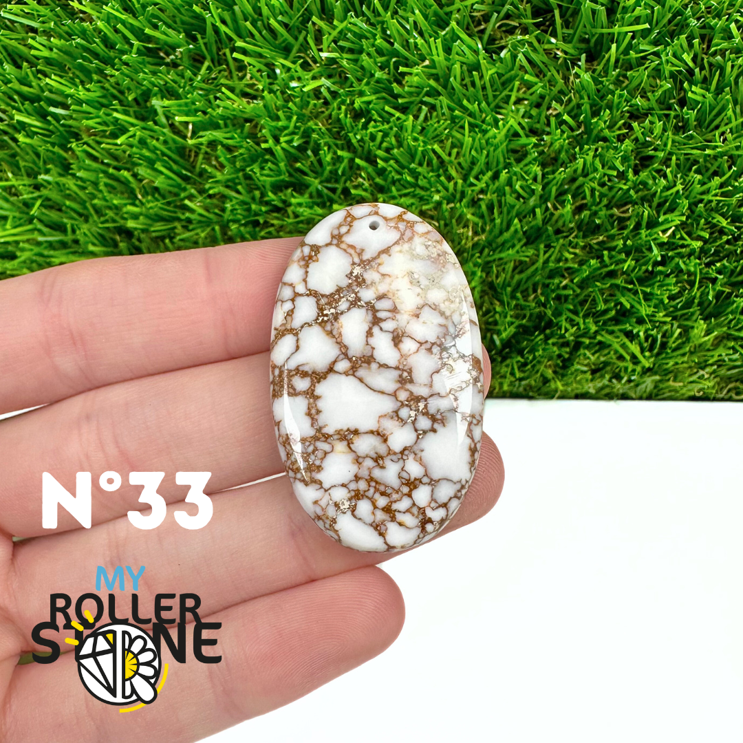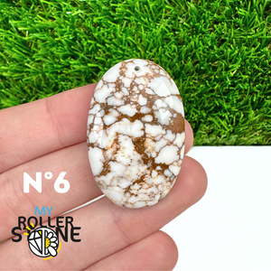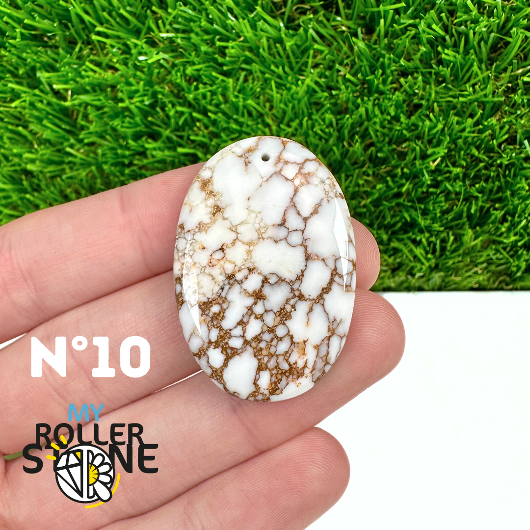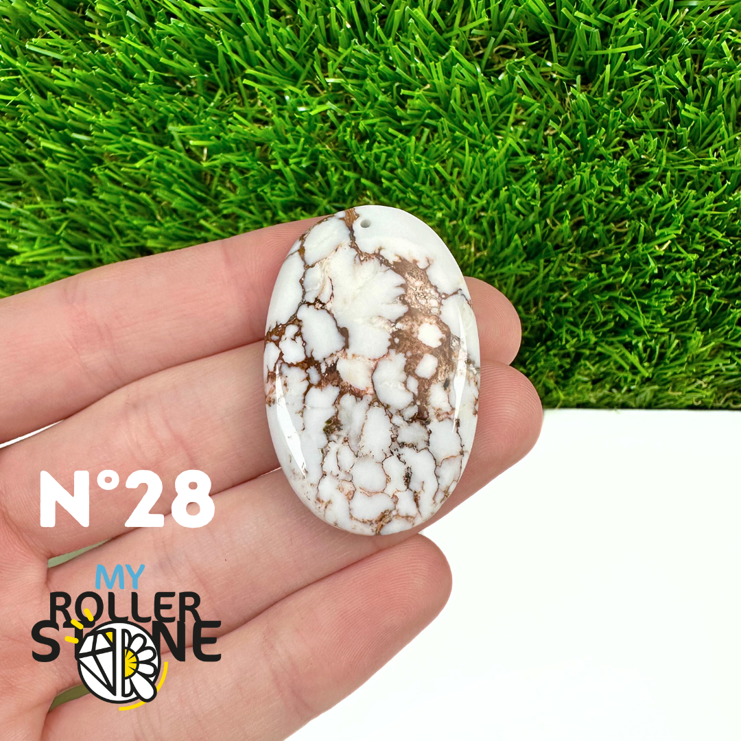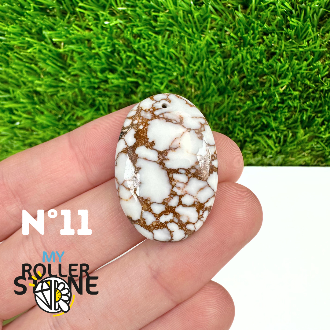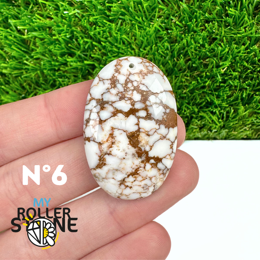 La Magnésite « Cheval Sauvage » (connue internationalement sous le nom Wild Horse Magnesite) est une pierre naturelle reconnaissable à ses forts contrastes entre des tons crème à blanc et des veines brun foncé à noires. Son aspect brut et graphique évoque les paysages arides et l’esprit libre, ce qui en fait une pierre très appréciée en bijouterie artisanale.