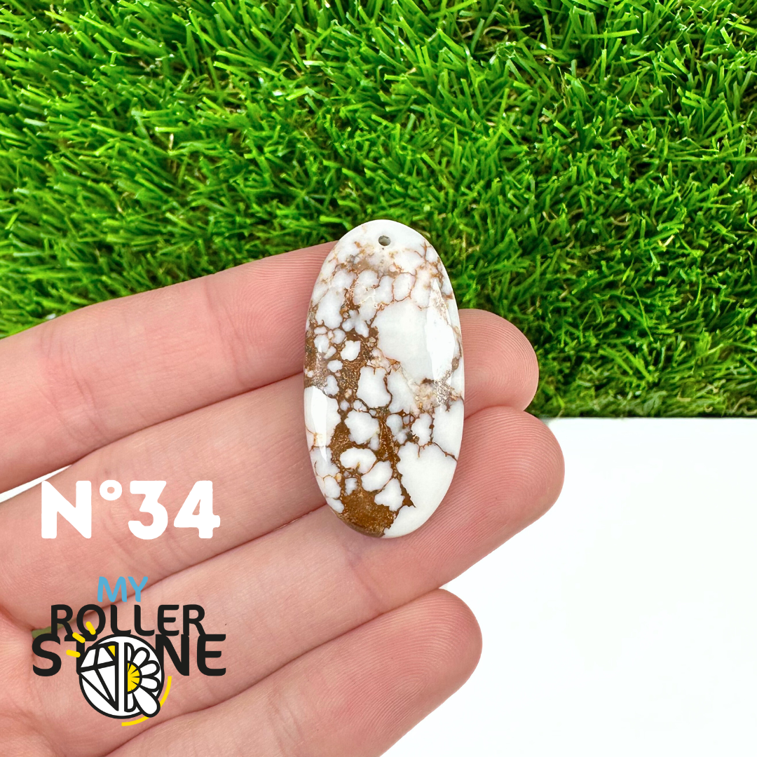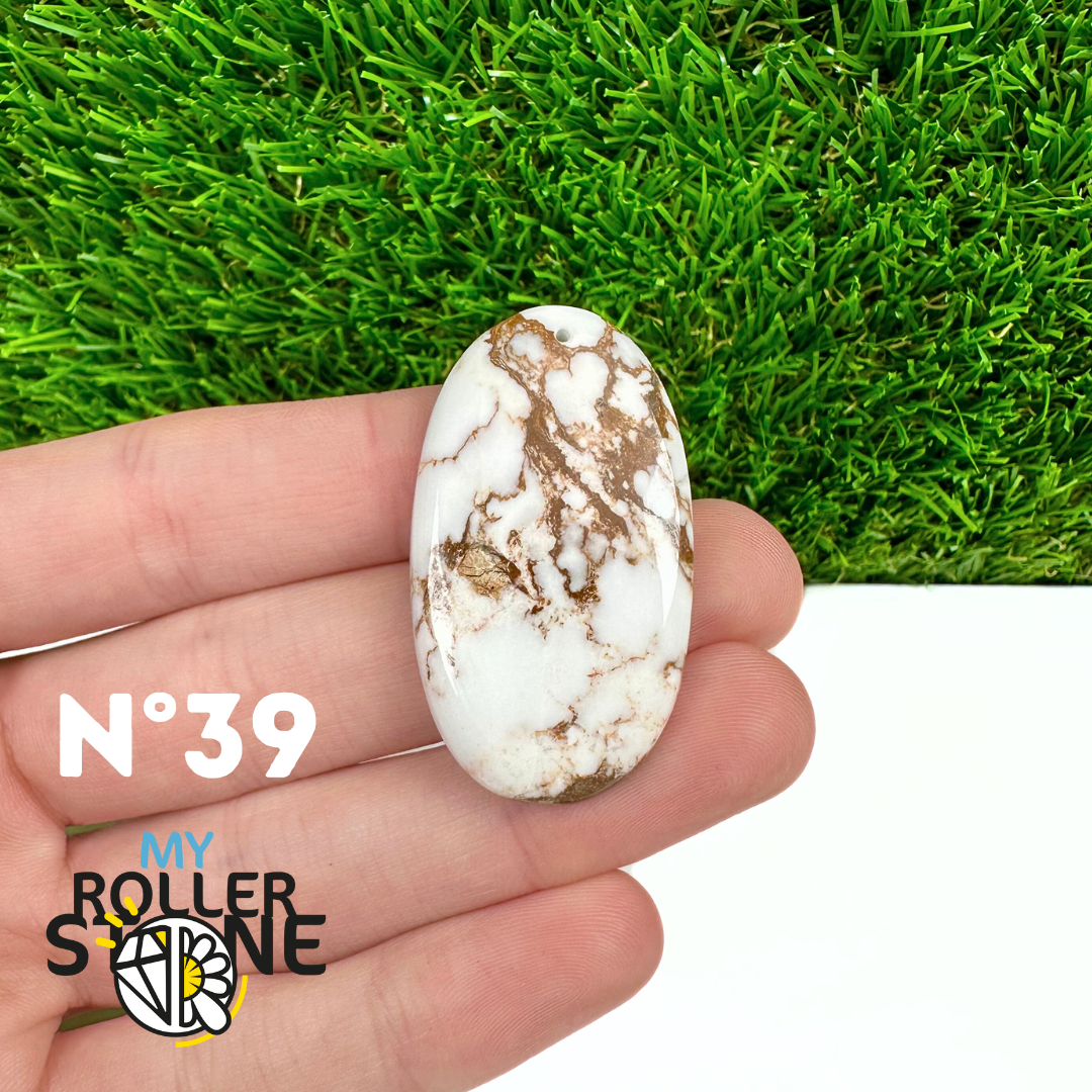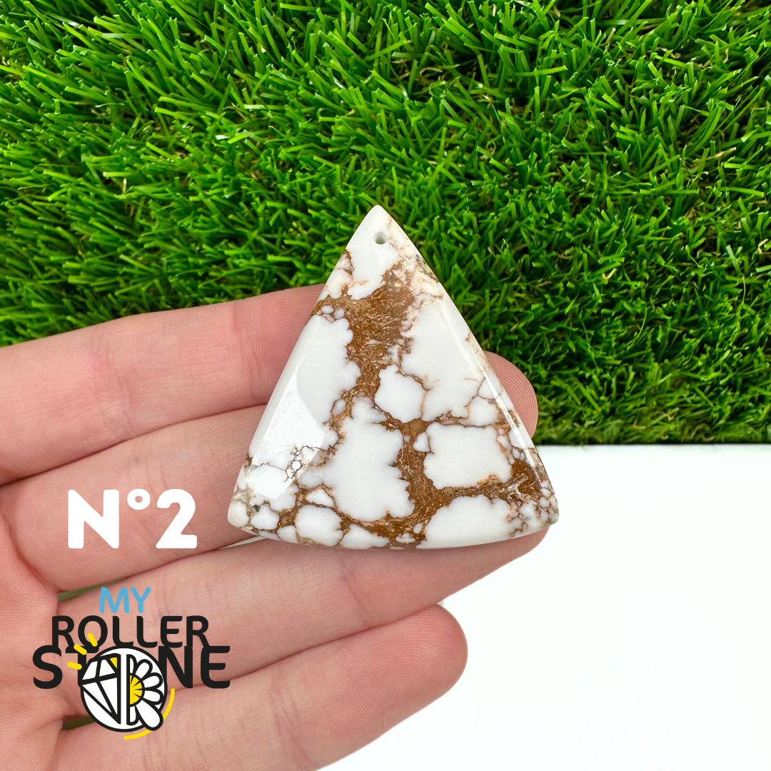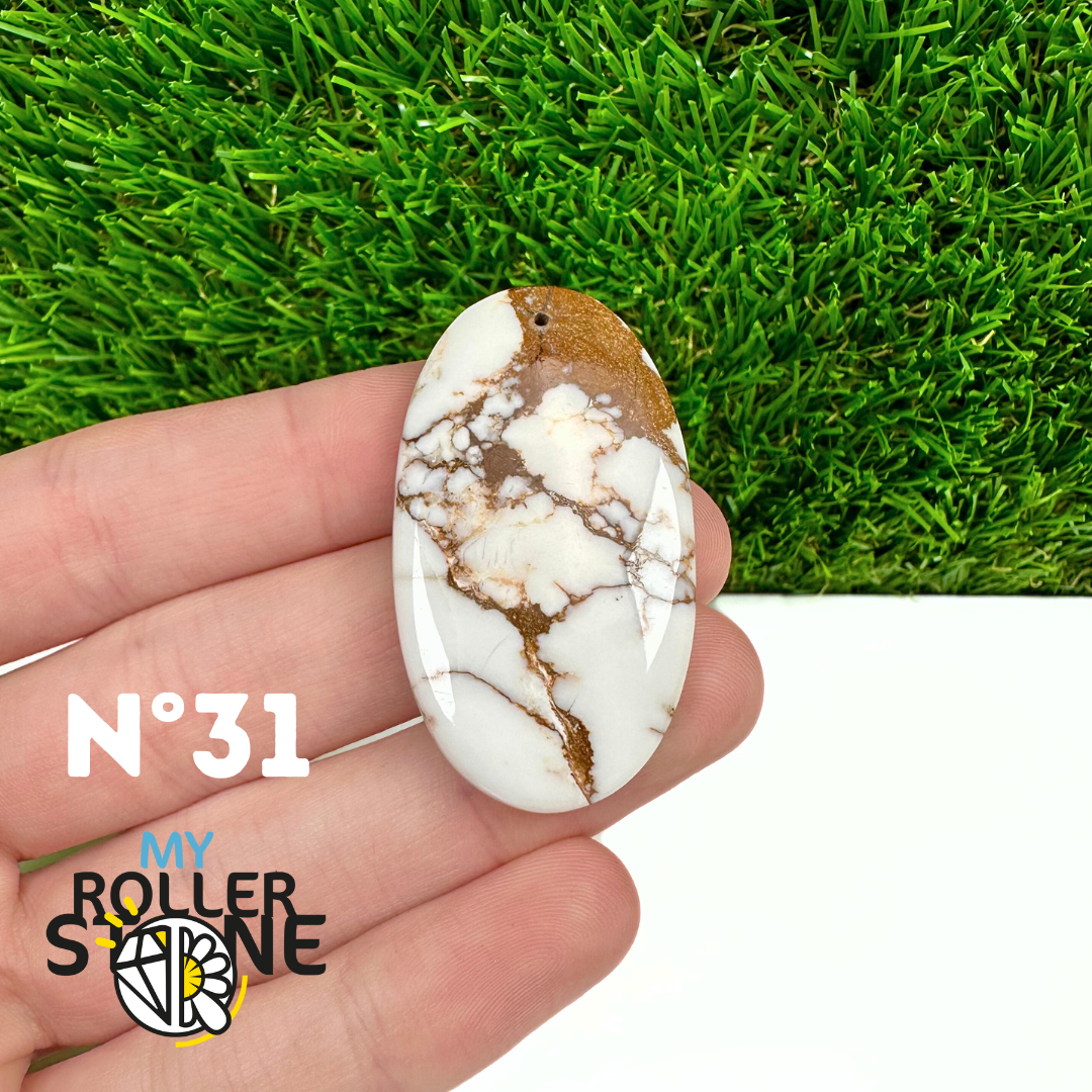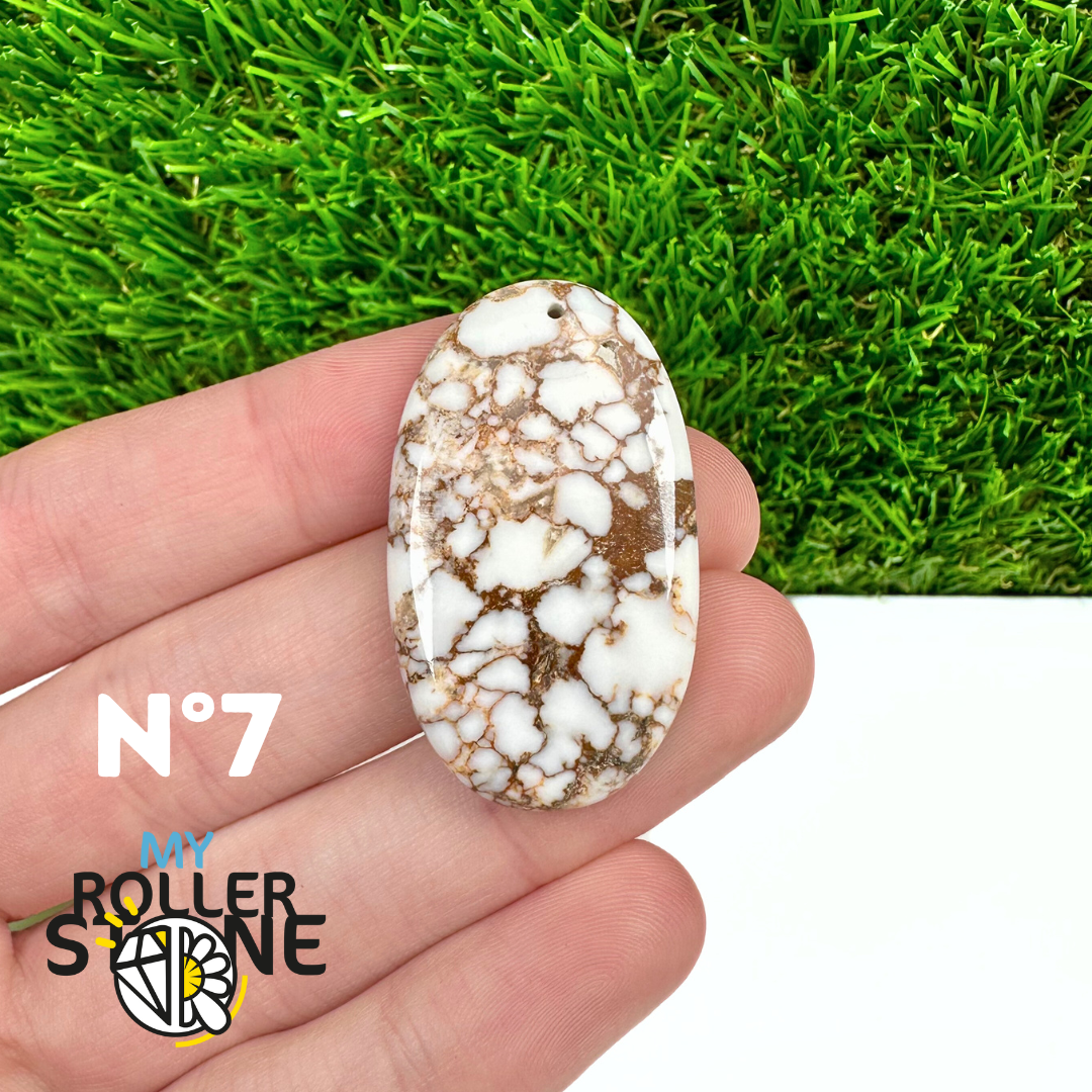 La Magnésite « Cheval Sauvage » (connue internationalement sous le nom Wild Horse Magnesite) est une pierre naturelle reconnaissable à ses forts contrastes entre des tons crème à blanc et des veines brun foncé à noires. Son aspect brut et graphique évoque les paysages arides et l’esprit libre, ce qui en fait une pierre très appréciée en bijouterie artisanale.