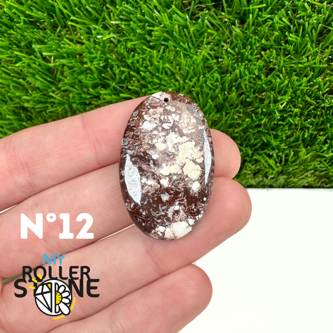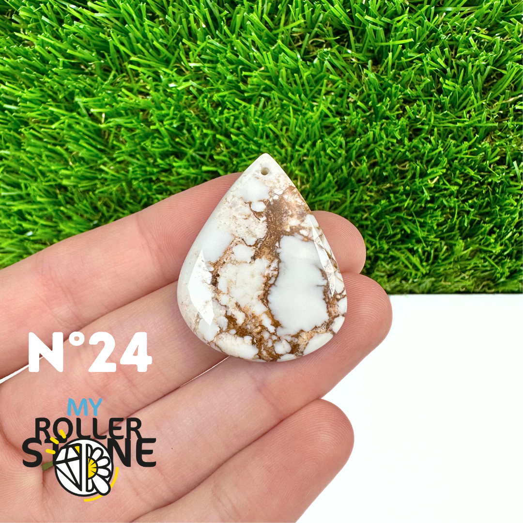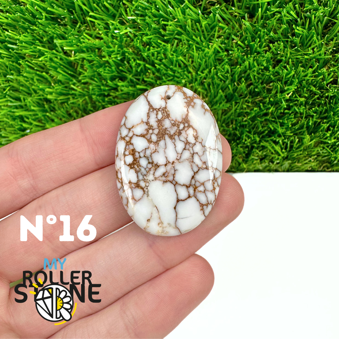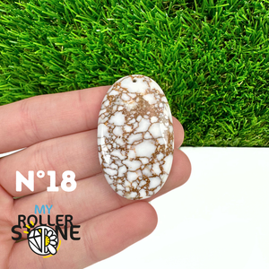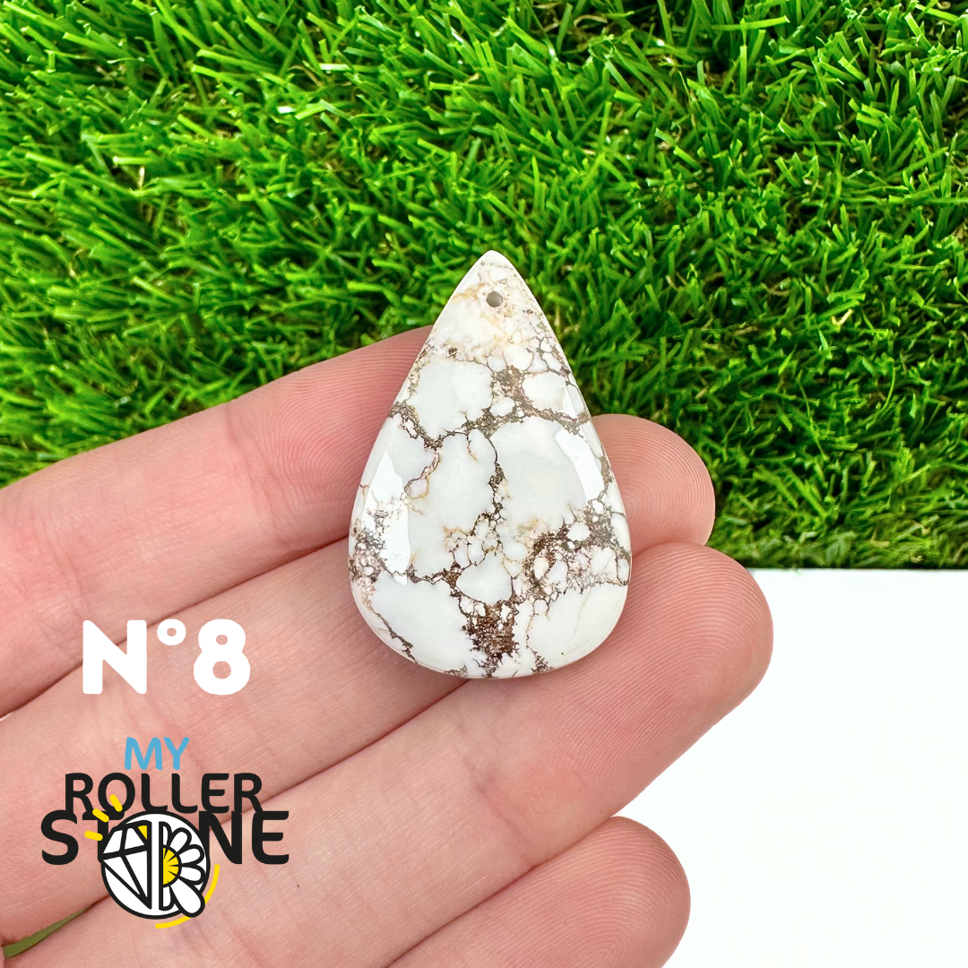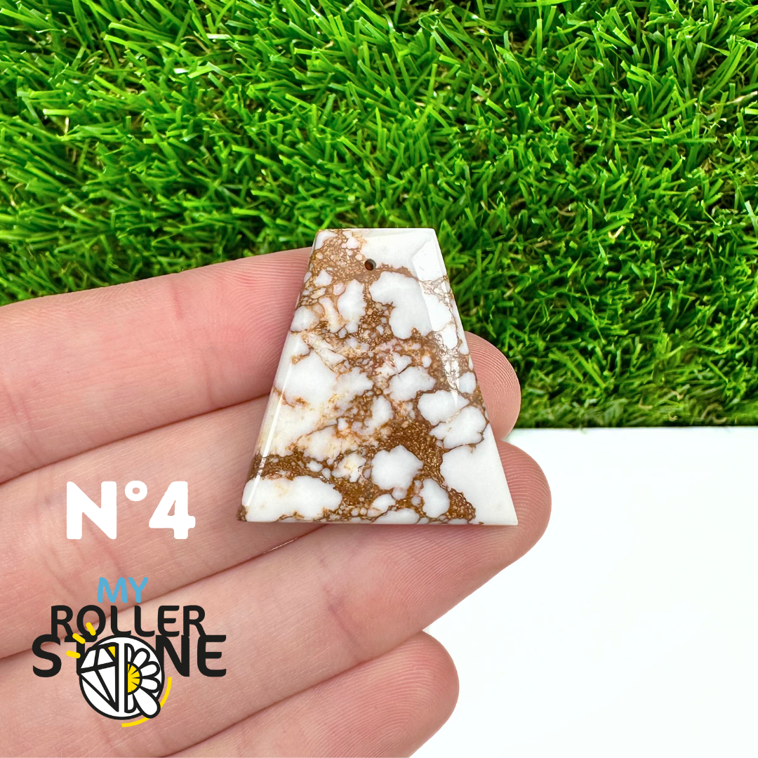 La Magnésite « Cheval Sauvage » (connue internationalement sous le nom Wild Horse Magnesite) est une pierre naturelle reconnaissable à ses forts contrastes entre des tons crème à blanc et des veines brun foncé à noires. Son aspect brut et graphique évoque les paysages arides et l’esprit libre, ce qui en fait une pierre très appréciée en bijouterie artisanale.