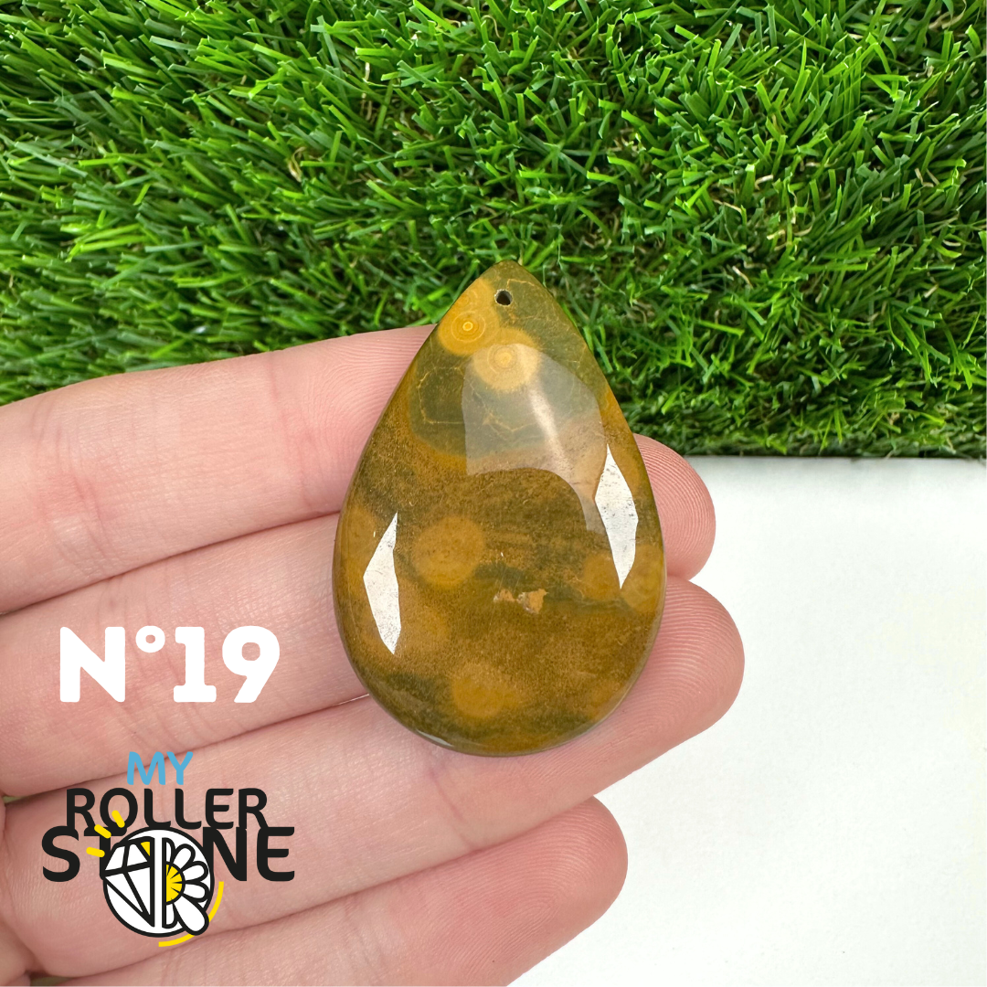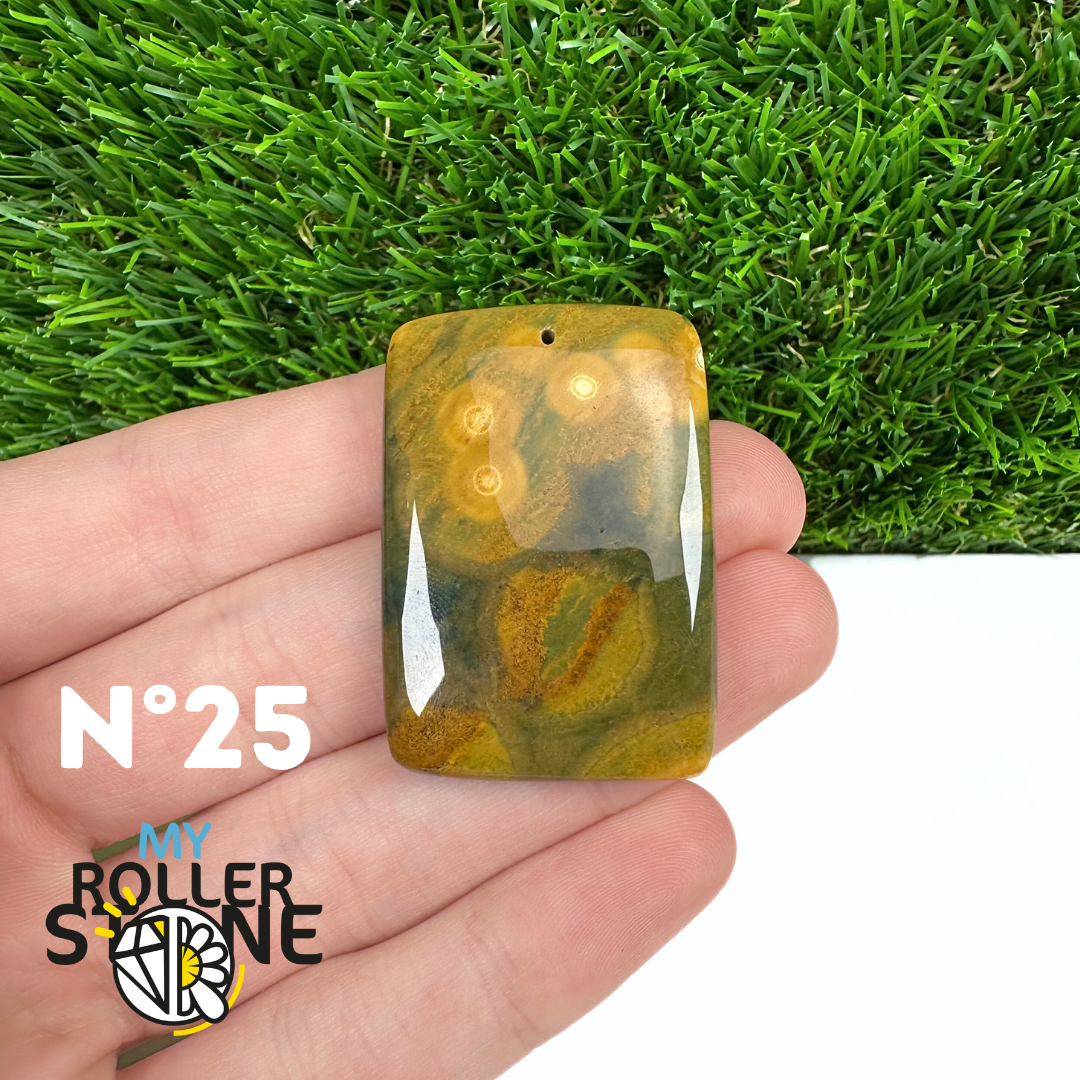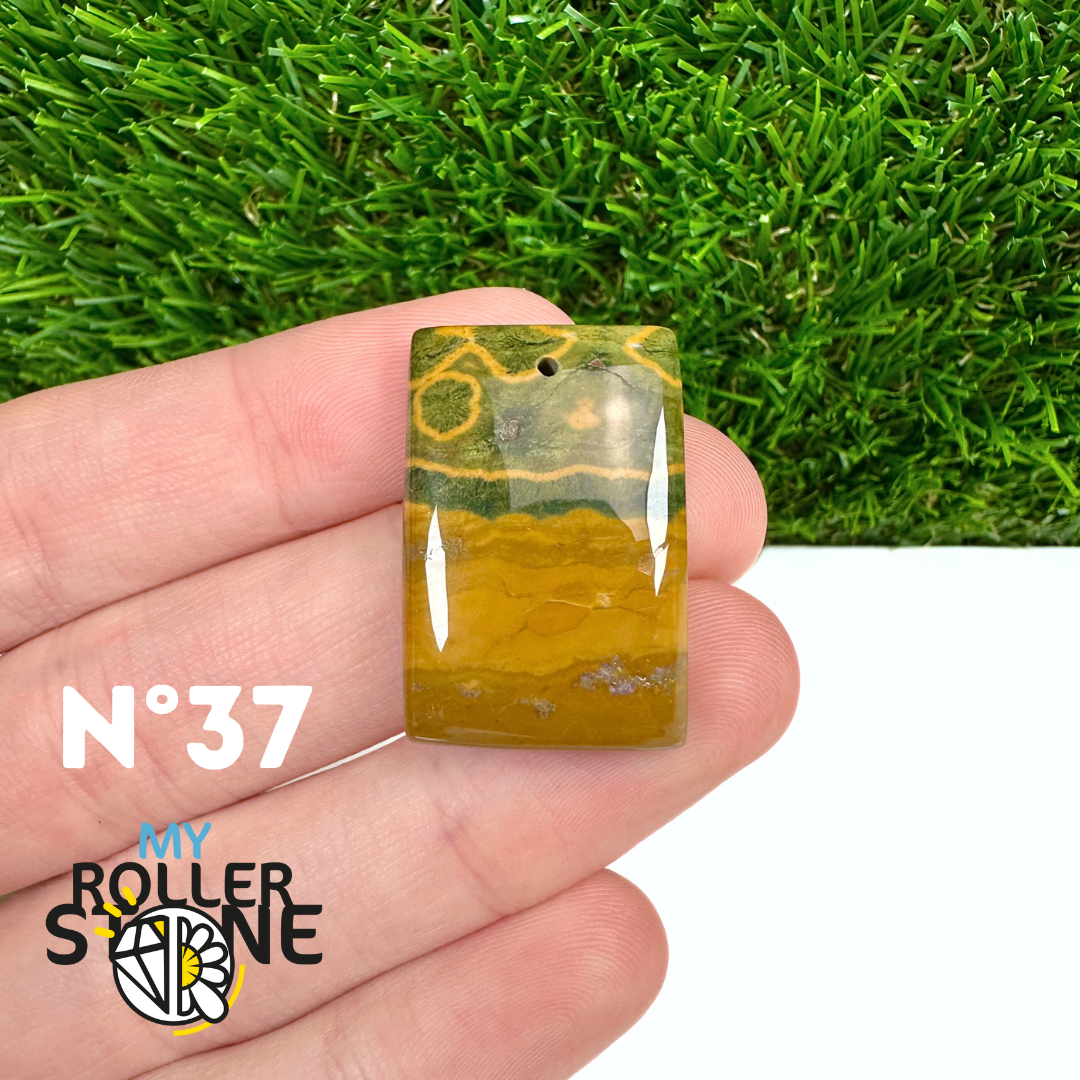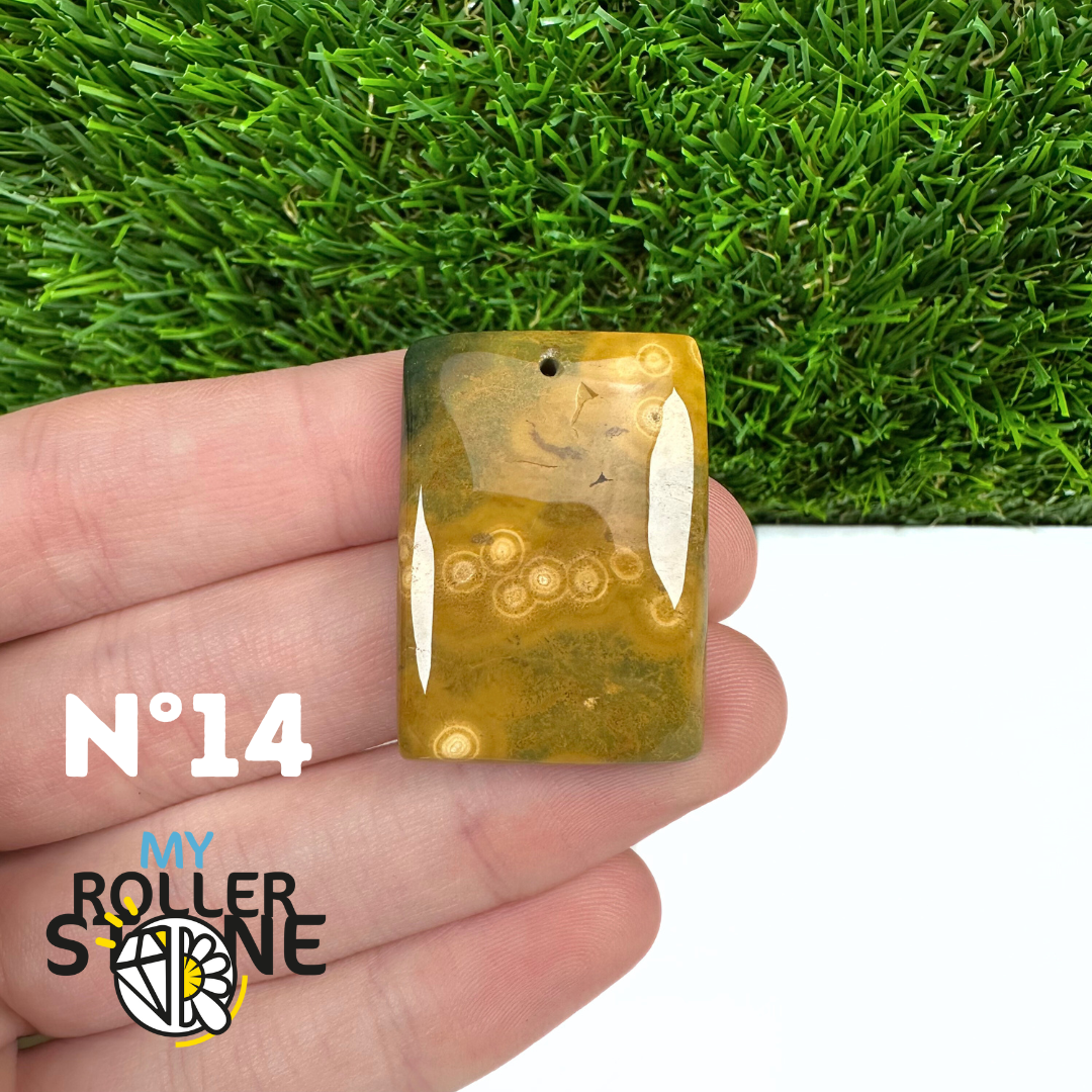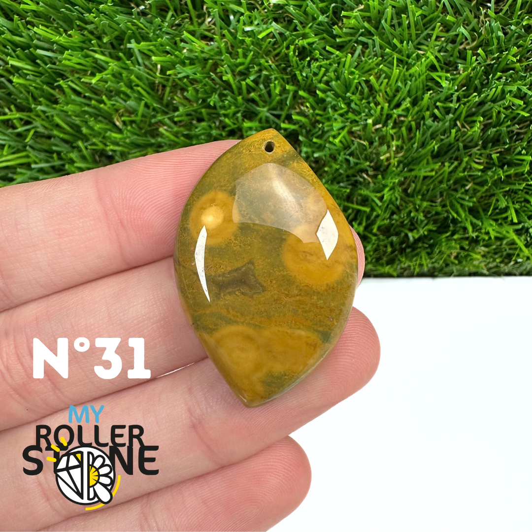 Ce pendentif percé en Jaspe Océan naturel – qualité 5A se distingue par ses motifs circulaires et ondulés caractéristiques, mêlant des nuances de vert, beige, crème, rose ou brun. Sélectionné pour sa qualité supérieure, chaque pendentif présente une richesse graphique remarquable et une finition polie soignée, faisant de chaque pièce un bijou unique.