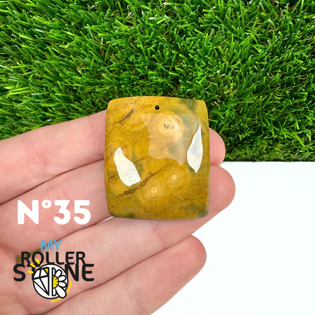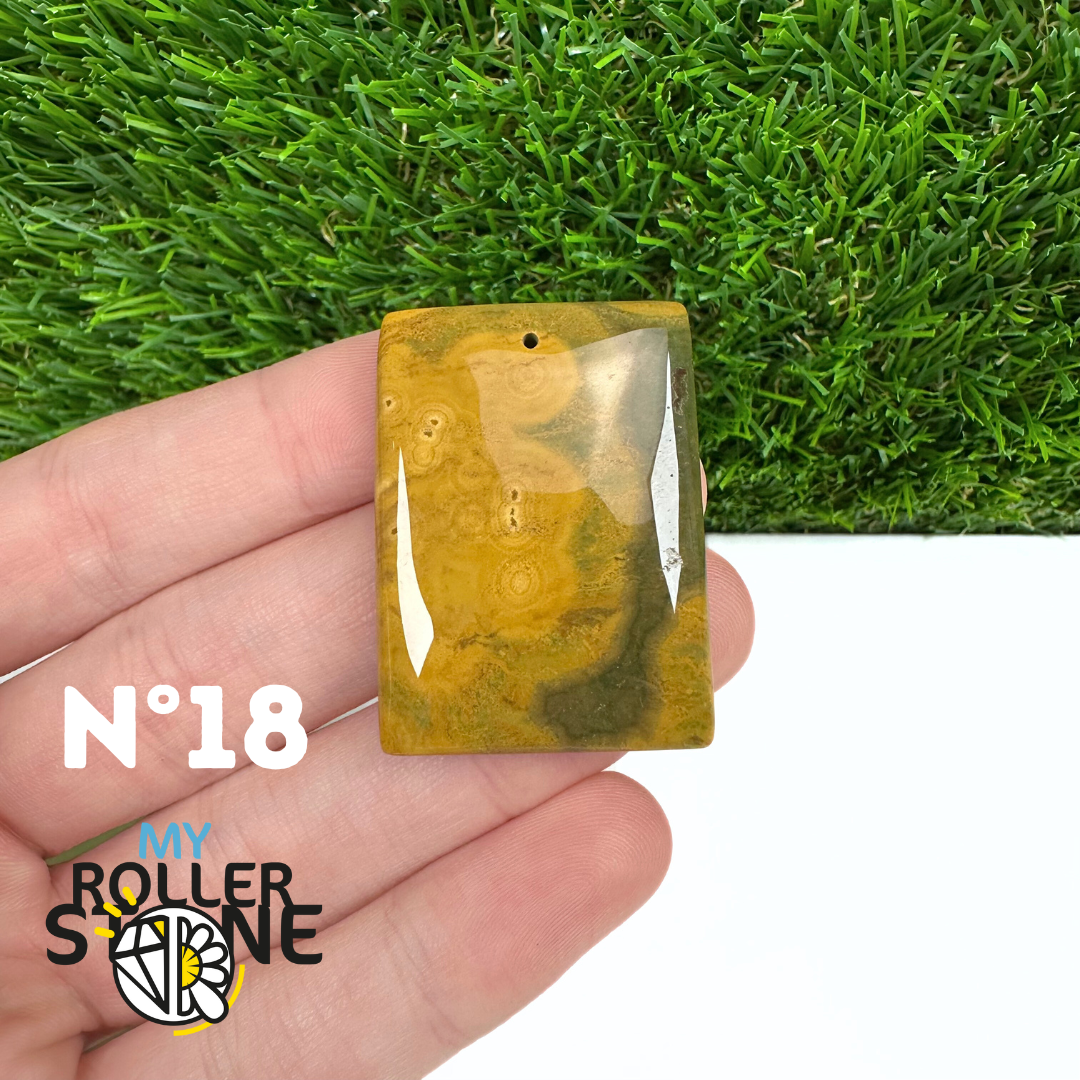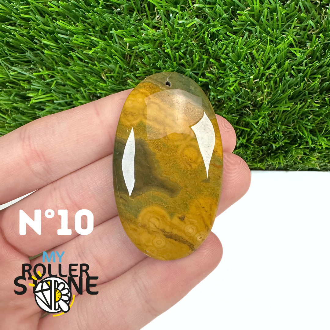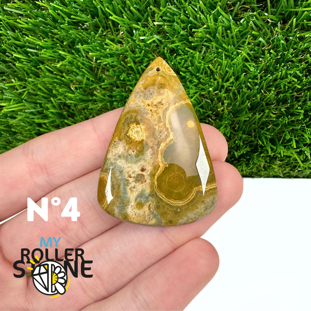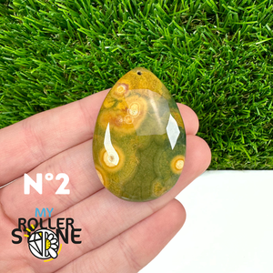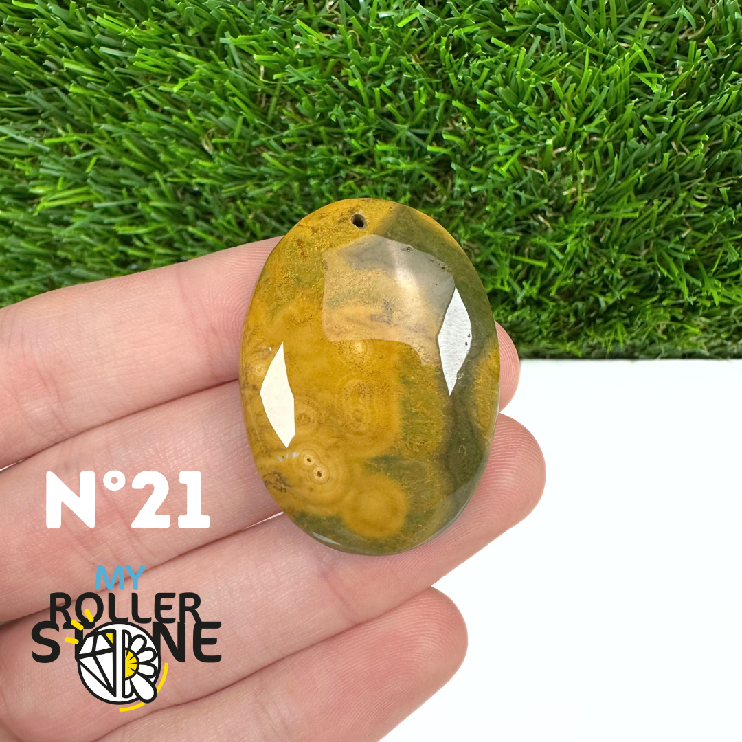 Ce pendentif percé en Jaspe Océan naturel – qualité 5A se distingue par ses motifs circulaires et ondulés caractéristiques, mêlant des nuances de vert, beige, crème, rose ou brun. Sélectionné pour sa qualité supérieure, chaque pendentif présente une richesse graphique remarquable et une finition polie soignée, faisant de chaque pièce un bijou unique.