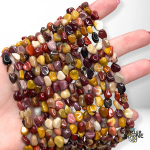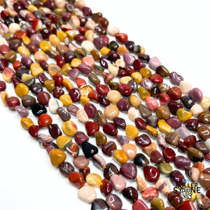 Mookaïte est une variété rare de jaspe trouvée dans la région de Mooka Creek. Ces perles baroques, polies avec soin, conservent leur structure naturelle et leurs teintes vibrantes formées par des dépôts minéraux anciens. Chaque fil est unique, combinant puissance minérale et élégance rustique.